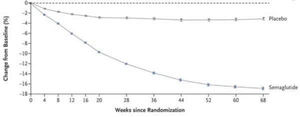 In the graph below, participants with (BMI >30) took 2.4 mg Semaglutide each week for 68 weeks. The treatment group lost about 15% body weight (37 lb for a 250 lb individual). The placebo group lost 2.4% body weight. You can expect even better results combined with a medical weight loss program.